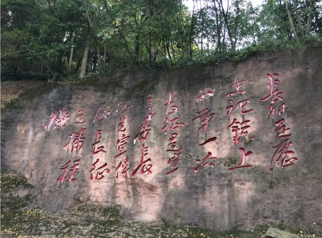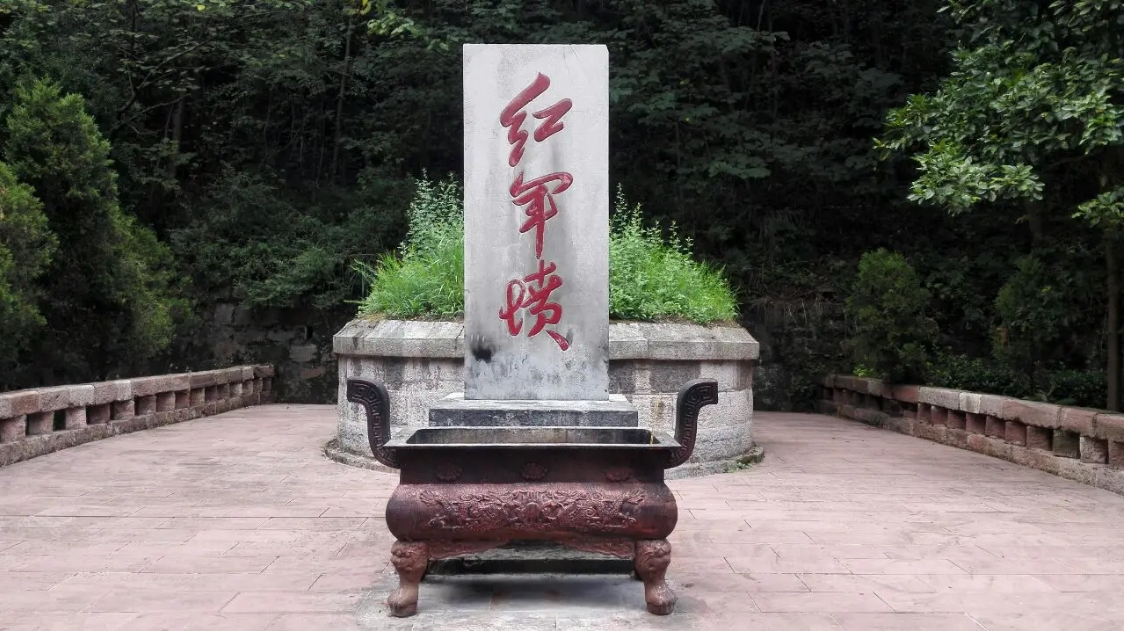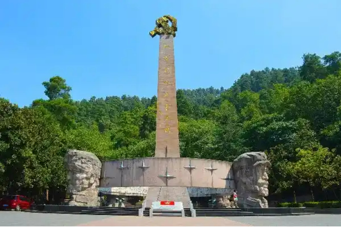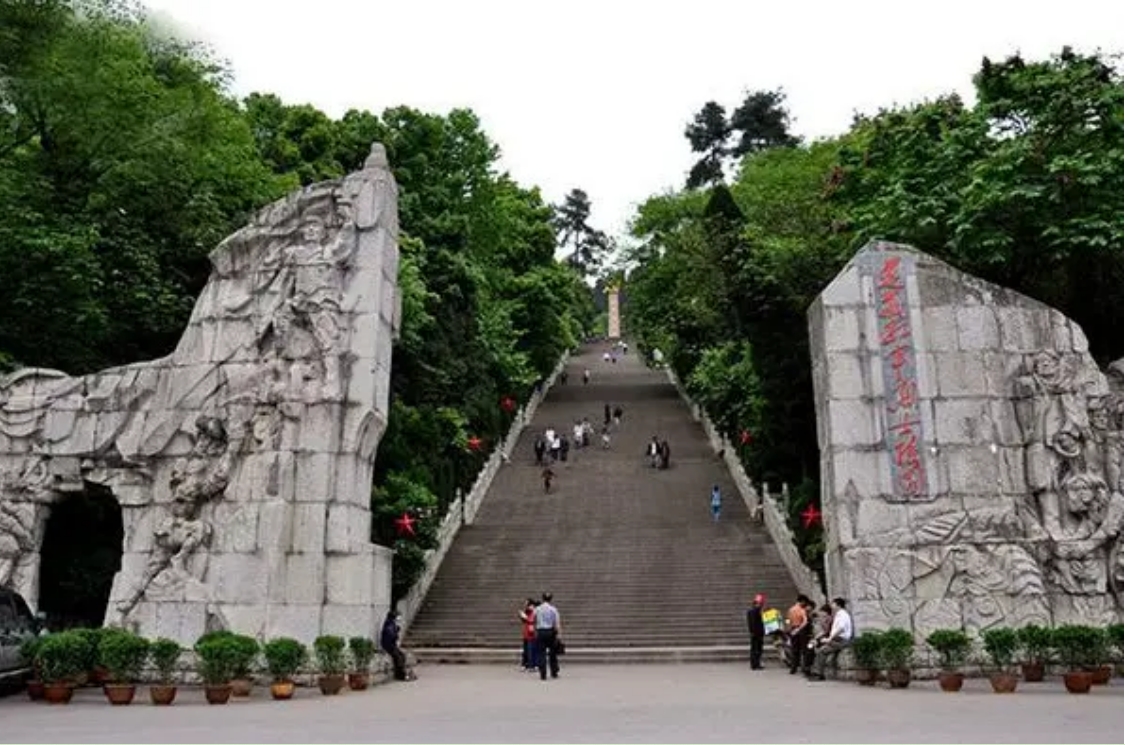 红军山,原名小龙山,遵义会议曾在这里举办。漫步出会址,路过扬柳街一侧的红军总政治部驻地,一座郁郁葱葱的山岗便是遵义红军烈士陵园,人们尊称为“红军山”。贵州省遵义红军山纪念碑位于遵义市小龙山上,陵园正面碑正面是邓小平同志手书的竖写“红军烈士永垂不朽”八个金色大字。碑后是红三军团参谋长邓萍墓。为纪念遵义会议五十周年时兴建的一座别具特色的纪念碑。