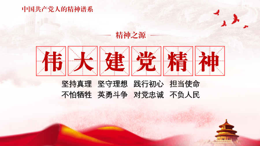 伟业蒸腾向上,精神世代承传。在礼序乾坤、乐和天地的庆祝中国共产党成立100周年大会上,习近平总书记第一次鲜明提出并深刻阐释了具有伟大历史意义和时代价值的伟大建党精神。他指出:“一百年前,中国共产党的先驱们创建了中国共产党,形成了坚持真理、坚守理想,践行初心、担当使命,不怕牺牲、英勇斗争,对党忠诚、不负人民的伟大建党精神,这是中国共产党的精神之源。”伟大建党精神,是中国共产党与生俱来的红色基因,是百年大党在百年时空坐标中生长、传承、凝练、绽放的理论成果和精神标识,是党的其他红色精神的源头和起点,具有鲜明的政治性、科学性、人民性、创新性、实践性特点。它完善了中国革命精神链条的历史渊源和逻辑起点,使党的创建发展史与精神铸就史高度契合,使建党实践的辉煌原点和建党精神的伟大开篇相映生辉,是对马克思主义建党学说和中国共产党人精神谱系的丰富发展与独特贡献。