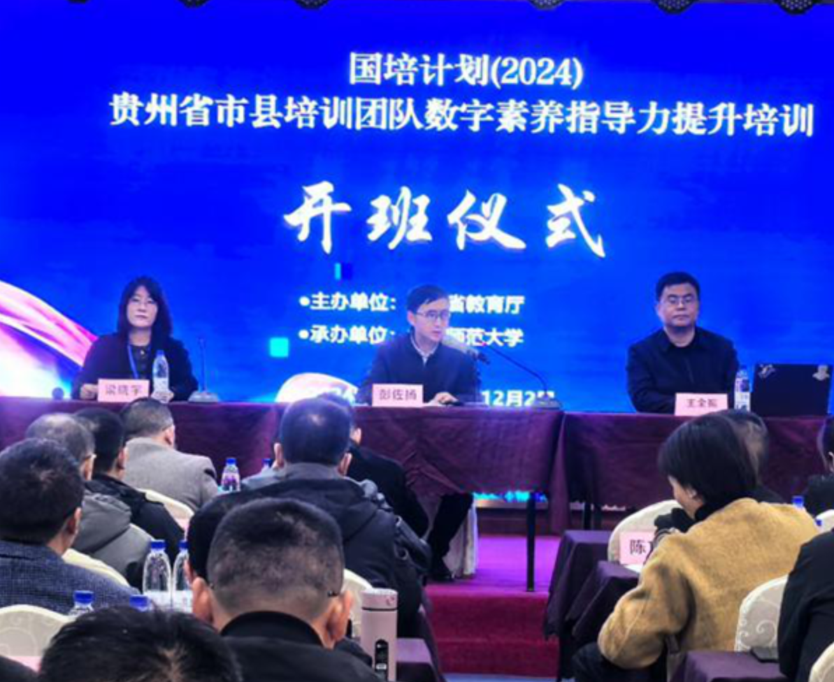 为深入学习贯彻党的二十大、二十届三中全会精神,贯彻落实全国、全省教育大会精神,深化全省县(市、区)电教战线人员、教研员对教育数字化转型的理解和认识,研究谋划县(市、区)今后一段时期的重点工作任务,切实推动全省教育数字化转型走深走实,1129日—122日,由省教育厅主办、华东师范大学承办的“国培计划(2024)”——贵州省市县培训团队数字素养提升指导力提升培训班在贵阳举办。受省教育厅欧阳嘉副厅长委托,电教馆负责同志参加开班仪式并作辅导报告。全省县(市、区)电教战线负责人,教研员共285人分两个班参加培训。